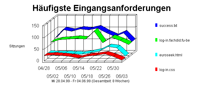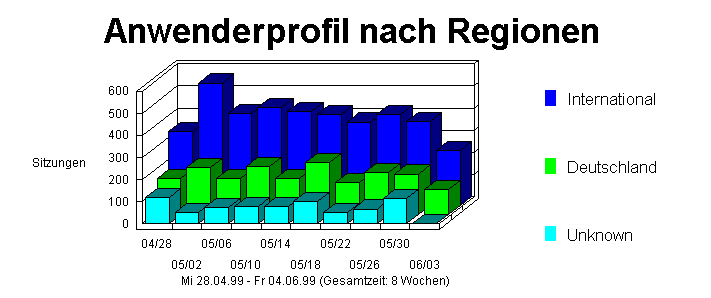 Diese Tabelle bietet eine allgemeine Übersicht über die Aktivitäten auf Ihrer Web-Site. Hit Hilfe dieser wichtigen statistischen Informationen können Sie Wachstum und Schwächen Ihrer Site auf einen Blick bestimmen. Die Tabelle zeigt Datum und Uhrzeit der Berichterstellung sowie die Zeitspanne, die dem Bericht zugrunde liegt. Datum und Uhrzeit beziehen sich auf den Ort des Systems, auf dem die Analyse ausgeführt wird.Die Anzahl der Hits auf der Homepage ist die Anzahl der erfolgreichen Hits für das HTML-Dokument, das Ihre Homepage darstellt.Diese Zahl beinhaltet keine Diagramme, die eventuell in der Seite enthalten sind.Die Gesamtanzahl der Hits bezieht sich auf alle erfolgreichen Hits auf HTML-Seiten, Grafiken, Formulare, Skripte und Dateiübertragungen (Downloads).Die Abschnitte "USA", "International" und "Unbekannt" bieten eine Übersicht über die Herkunftsländer der Anwender als Prozentteil der Hits.Unter "Mittlere Anzahl an Hits pro Tag" und "Mittlere Anzahl an Anwendersitzungen pro Tag" werden die Mittelwerte der erfolgreichen Hits und Anwendersitzungen auf Ihrer Web-Site für einen beliebigen Tag innerhalb der Berichtszeitspanne aufgeführt.Die Zahlen für eindeutige Besucher bedeuten die Anzahl der eindeutigen IPs während der Berichtszeitspanne, unabhängig davon, ob die Besucher eine Echtheitsbestätigung per Anwendername oder Cookie benötigten oder nicht.