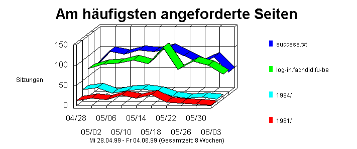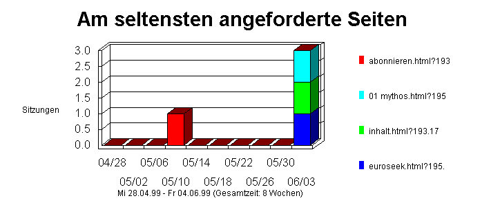In diesem Abschnitt werden die unbeliebtesten Seiten Ihrer Web-Site aufgeführt. Die Tabelle führt die Seiten nach der Anzahl der Hits sortiert auf, wobei sich die Seiten mit den wenigsten Hits oben in der Liste befinden. Die Anzahl der Hits bezieht sich nur auf die erfolgreichen Hits auf das HTML-Dokument und schließt eventuelle Zugriffe auf Grafiken nicht ein. Der Prozentteil der Gesamthits ist der Prozentteil der Hits auf dieses Dokument im Vergleich zu allen anderen HTML-Dokumenten.Tip: Die in dieser Tabelle erfaßten Dateitypen können konfiguriert werden. Öffnen Sie dazu die Registerkarte "File Types" im Dialogfeld "Options".Tip: Sie können bestimmen, daß sämtliche Seiten Ihrer Site aufgeführt werden. Stellen Sie dazu die Anzahl der Elemente (Number of items) so groß ein, daß sie größer als die Anzahl der Seiten auf Ihrer Site ist.