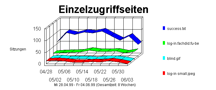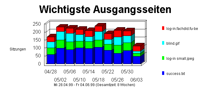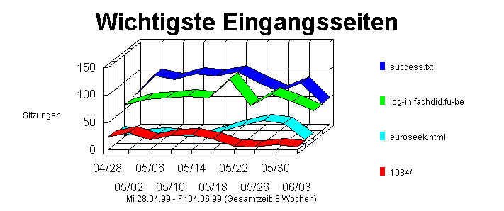 Dieser Abschnitt zeigt den ersten Hit eines Besuchers auf dieser Site. Dies ist im allgemeinen die Startseite, kann aber manchmal auch eine bestimmte URL-Adresse sein, die der Anwender eingibt, um direkt zu einer bestimmten Seite zu gelangen. Wenn der Anwender z.B. die Adresse http://www.WebTrends.com/WT-QA.HTM eingibt, "betritt" er die Site an der Seite WT-QA.HTM. Die Prozente beziehen sich auf die Gesamtzahl der Anwendersitzungen. Wenn eine Sitzung mit einem Dokument startet, das einen anderen Typ hat (z.B. eine Grafik- oder Sounddatei), dann wird diese Datei nicht als Eingangsseite gezählt, und die Sitzung wird im Gesamtwert nicht berücksichtigt. Solche Sitzungen sind häufig das Ergebnis von Verweisen von anderen Sites, bei denen auf eine bestimmte herunterladbare Datei oder Grafik verwiesen wurde. In solchen Fällen kann eine Sitzung aus einem einzigen Hit auf eine Datei bestehen, deren Dateityp keine Dokumentdatei ist, und wird in Prozentberechnung nicht berücksichtigt.Darüber hinaus protokollieren Webserver Hits nicht immer perfekt in chronologischer Reihenfolge. Ein Hit auf eine GIF-Datei kann im Log z.B. vor dem Hit auf die HTML-Seite, die die GIF-Datei enthält, aufgezeichnet werden.