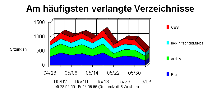 Dieser Abschnitt analysiert den Zugriff auf die verschiedenen Verzeichnisse auf Ihrer Site. Die Tabelle führt die am häufigsten verlangten Verzeichnisse in absteigender Reihenfolge nach der Anzahl der Hits sortiert auf. Der nicht-zwischengespeicherte Prozentteil ist der Prozentteil der Hits, die sich nicht schon im Browser-Cache befanden. Diese Informationen können bei der Bestimmung der am häufigsten angeforderten Datentypen nützlich sein.