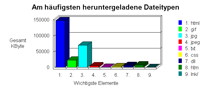Dieser Abschnitt zeigt die heruntergeladenen Dateitypen sowie die Gesamtzahl der Kilobytes, die für die einzelnen Dateitypen heruntergeladen wurde. Cache-gespeicherte Anforderungen fehlerhafte Hits werden nicht gewertet. Die Tabelle führt die Typen der heruntergeladenen Dateien in abnehmender Reihenfolge nach der Anzahl der Downloads sortiert auf und gibt zu jedem Dateityp die Anzahl der übertragenen Kilobytes an.Tip: Die in dieser Tabelle erfaßten Dateitypen können konfiguriert werden. Öffnen Sie dazu die Registerkarte "File Types" im Dialogfeld "Options".
