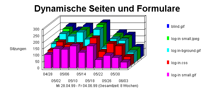 Dieser Abschnitt zeigt, wie viele Formulare erfolgreich eingereicht wurden im Vergleich zu den Formularen, bei denen die Einreichung fehlgeschlagen ist. WebTrends betrachtet alles, was einen Post-Befehl oder einen Befehl mit einem '?' enthält, als dynamische Seite.
