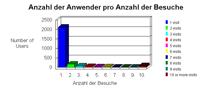 Dieser Abschnitt zeigt die Verteilung der Anwender relativ zu der Häufigkeit mit der jeder einzelne Anwender diese Web-Site besucht hat. Dies umfaßt nur Besuche während der Berichtszeitspanne. Wenn ein Besucher die Site vor oder nach der Berichtszeitspanne besucht hat, wird dieser Besuch in der Anzahl seiner Besuche nicht berücksichtigt.