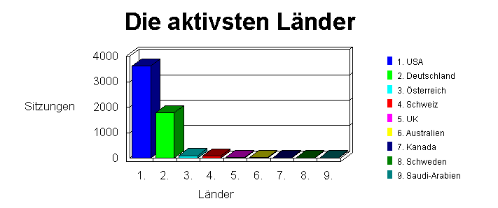 Dieser Abschnitt führt die Hauptherkunftsländer der Besucher auf Ihrem Web-Server auf, nach Land sortiert. Das Land des Besuchers wird vom Suffix seines Domänennamen ermittelt. Ist die umgekehrte DNS-Übersetzung (Reverse DNS) auf Ihrem Server auf "Never" eingestellt, oder hat Ihr Server die umgekehrte DNS-Übersetzung noch nicht durchgeführt, kann WebTrends das Herkunftsland nicht bestimmen, und dieser Abschnitt wird in Ihrem Bericht nicht enthalten sein. Die Tabelle führt die wichtigsten Länder in abnehmender Reihenfolge nach der Anzahl der Hits sortiert auf.