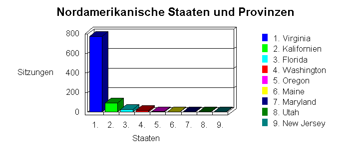 In diesem Abschnitt werden die Aktivitäten auf der Web-Site aufgeteilt, um zu zeigen, welche der Nordamerikanischen Staaten und Provinzen am aktivsten waren. Die Tabelle führt Staaten und Provinzen in abnehmneder Reihenfolge nach der Anzahl der Anwendersitzungen sortiert auf. Die Daten werden vom Domänennamen des Besuchers und der mit WebTrends gelieferten Firmendatenbank bestimmt. Diese Informationen können nur dann angezeigt werden, wenn die umgekehrte DNS-Übersetzung (Reverse DNS) auf "Always" oder "Automatically" eingestellt ist oder wenn Ihr Server die DNS-Übersetzung schon durchgeführt hat.