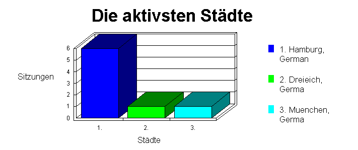 Dieser Abschnitt unternimmt eine weitere Einteilung der Aktivitäten auf der Web-Site, um die Städte aufzuführen, die auf Ihrer Site am aktivsten waren. Die Daten werden vom Domänennamen des Besuchers und der mit WebTrends gelieferten Firmendatenbank bestimmt. Diese Informationen können nur dann angezeigt werden, wenn die umgekehrte DNS-Übersetzung (Reverse DNS) auf "Always" oder "Automatically" eingestellt ist oder wenn Ihr Server die DNS-Übersetzung schon durchgeführt hat.
