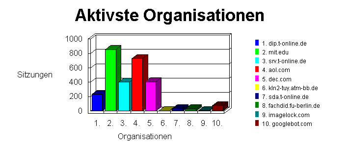 In diesem Abschnitt werden die Firmen bzw. Organisationen identifiziert, die am häufigsten auf Ihre Web-Site zugegriffen haben. Wurde die umgekehrte DNS-Übersetzung (Reverse DNS) nicht auf "Always" oder "Automatically" eingestellt, durchsucht WebTrends die im Programmpaket enthaltende Firmendatenbank nach dem Domänennamen und schließt dann den Firmennamen und die geographische Informationen in Diagramm und Tabelle mit ein. Ist "Reverse DNS" auf "Never" eingestellt, werden nur IP-Adressen aufgeführt. In der Tabelle werden Firmen und Organisationen nach der Anzahl der Hits sortiert und in abnehmender Reihenfolge aufgeführt.