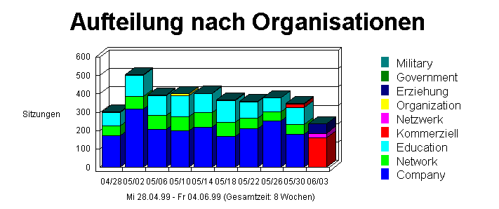 Dieser Abschnitt zeigt eine Einteilung nach Organisationstypen (.com, .net, .edu, .org, .mil und .gov). Die Tabelle führt die Organisationstypen in absteigender Reihenfolge nach der Anzahl der Hits sortiert auf. Gezeigt wird auch der Prozentteil von den Gesamthits, die Anzahl der Anwendersitzungen und die Gesamtanzahl für beide Kategorien. Diese Informationen können nur dann angezeigt werden, wenn die umgekehrte DNS-Übersetzung (Reverse DNS) auf "Always" oder "Automatically" eingestellt ist oder wenn Ihr Server die DNS-Übersetzung schon durchgeführt hat. Der Prozentteil bezieht sich auf die Gesamt-Hitzahl, für die der Organisationstyp bestimmt werden kann (von manchen IP-Adressen kann kein Domänenname bestimmt werden, in welchem Fall ein Organisationstyp nicht bestimmt werden kann).