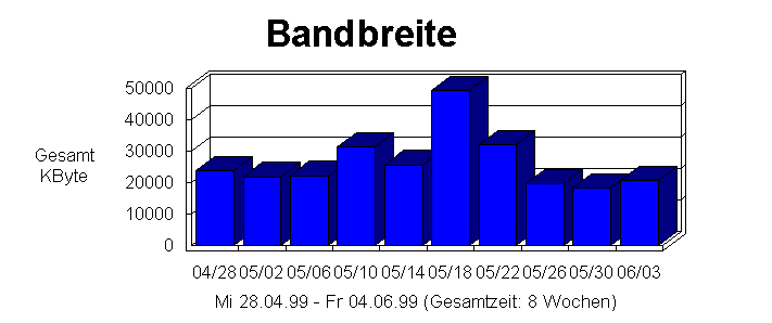 Dieser Abschnitt hilft bei der Bestimmung der benötigten Bandbreite für Ihre Site. Er zeigt das Aktivitätsvolumen als Hits bzw. übertragene Kbytes. Die Tabelle bietet verschiedene Aktivitätsmaße in Zeiteinheiten über die Berichtszeitspanne (die Zeiteinheit hängt von der Berichtszeitspanne ab und ist gewähnlich in Tagen).