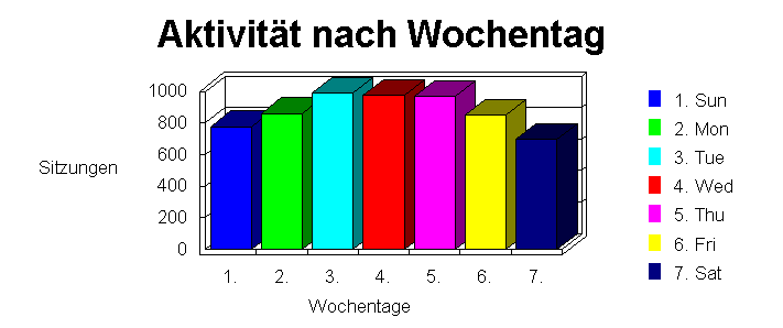 Dieser Abschnitt zeigt die Aktivität an den einzelnen Wochentagen während der Berichtszeitspanne (wenn die Bereichtszeitspanne z.B. zwei Montage enthält, entspricht die Zahl der Summe aller Hits an beiden Montagen). Die Tabelle listet die Anzahl der Hits, Prozentteil von Gesamthits und Anwendersitzungen für die einzelnen Wochentage während der Berichtszeitspanne. Die Zeile "Wochenende gesamt" gibt die Anzahl der Hits an Wochenenden (Samstag und Sonntag) während der Berichtszeitspanne wieder. Die Tabellenwerte enthalten keine fehlerhaften Hits.