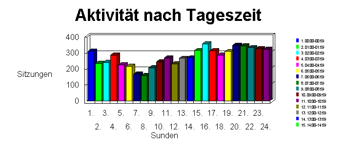 Diese Abschnitt zeigt die aktivste und die inaktivste Tageszeit während der Berichtszeitspanne. In der zweiten Tabelle sind die Aktivitäten aufgeteilt, um die Aktivität während der einzelnen Stunden aufzulisten (wenn die Bereichtszeitspanne mehrere Tage umfaßt, entspricht die Zahl der Summe aller Hits während der gegebenen Tageszeit). Die Tabelle listet den Prozentteil von den Gesamthits und die Anwendersitzungen auf sowie die Gesamtwerte während der Tagesstunden (8.00 - 17.00 Uhr) sowie während der Nachtstunden (17.01 - 7.59 Uhr). Diese Informationen sind dann nützlich, wenn die günstigste Tageszeit für Systemwartungen bestimmt werden soll. Sämtliche Uhrzeiten beziehen sich auf den Ort des Systems, auf dem die Analyse ausgeführt wird.