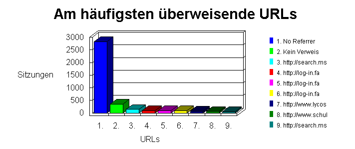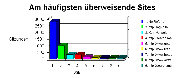 Dieser Abschnitt stellt die vollständigen URLs der Sites dar, die Links zu Ihrer Site haben. Die Tabelle zeigt die Domänennamen, falls die umgekehrte DNS-Übersetzung auf "Always" oder "Automatisch" eingestellt ist. Es werden IP-Adressen gezeigt, falls die umgekehrte DNS-Übersetzung auf "Never" eingestellt ist. Besucher, die Ihr URL in der Adressenzeile eingegeben haben, sind auch nicht enthalten.Tip: Sie können Überweisungen von Ihrer eigenen Site ausschließen, indem Sie Ihr URL im Profilfilter angeben.