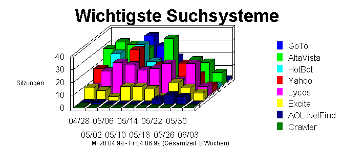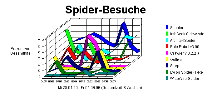 Dieser Abschnitt identifiziert sämtliche Roboter, Spider, Crawler und Suchdienste (z.B. Alta Vista, Lycos und Excite), die Ihre Site besucht haben. Diese Information ist für einen Web-Master wichtig, der versucht, Spider zu blockieren, die den Web-Server laden. Diese Informationen werden nur dann angezeigt, wenn Ihr Server Browser/Plattform-Informationen protokolliert.