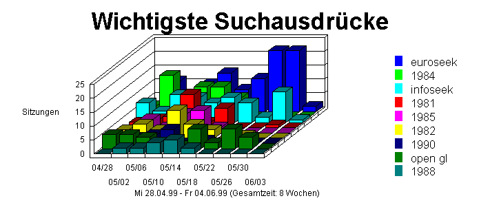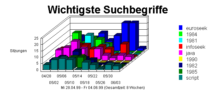 Die erste Tabelle zeigt, welche Suchausdrücke die meisten Besucher zu der Site geführt haben. Die Gesamtwerte in dieser Tabelle beziehen sich auf die Anzahl der Suchausdrücke (unabhängig von dem Suchsystem). Die zweite Tabelle zeigt für die einzelnen Suchausdrücke, über welches Suchsystem die Besucher zu Ihrer Site gelangt sind.
