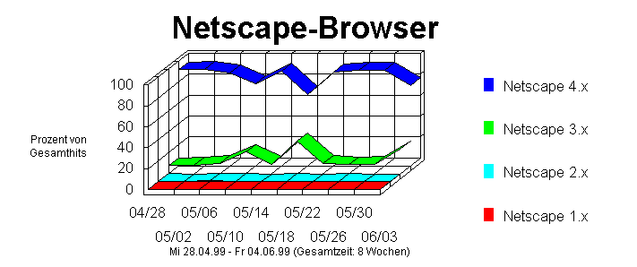 Dieser Abschnitt bietet eine Einteilung der verschiedenen Versionen von Netscape-Browsern, die Besucher zu Ihrer Site benutzen. Diese Information ist dann nützlich, wenn Sie den Prozentteil der Besucher bestimmen möchten, die neuere Browser benutzen, und ob versionsspezifische Funktionen (wie z.B. Java Skripts) auf Ihrer Site implementiert werden sollten. Diese Informationen werden nur dann angezeigt, wenn Ihr Server Browser/Plattform-Informationen protokolliert.
